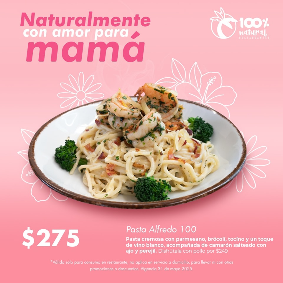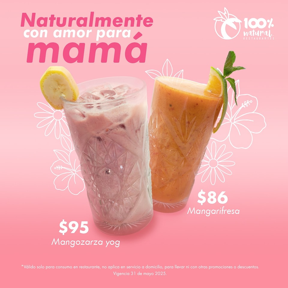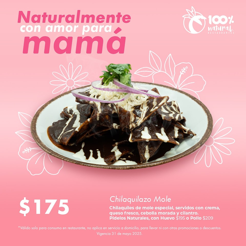 Una opción fresca, saludable y familiar. En 100% Natural se celebrará a las mamás con platillos coloridos, jugos naturales, ensaladas, crepas y especialidades ligeras, todo a precios especiales por el Día de las Madres. Su ambiente relajado y su filosofía saludable hacen de este lugar una opción perfecta para mamás que buscan cuidarse sin dejar de disfrutar.